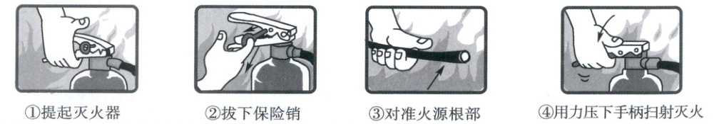 ①提起灭火器 ②拔下保险销 ③对准火源根部 ④用力压下手柄扫射灭火