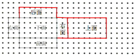 1. 下面是一个长方体的前面、左面和下面的展开图,在点子图上画出展开图的另外三个面,并标出每个面是长方体的什么面。(6 分)