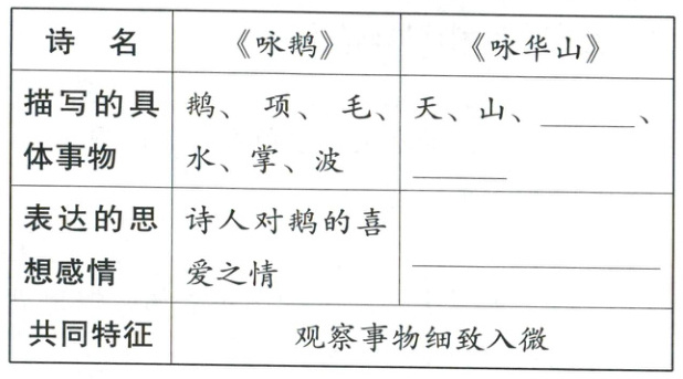 3. 小明惊奇地发现,这首诗歌是寇准在七岁时创作的,与初唐时期写下《咏鹅》的骆宾王年纪相同,于是针对这两首古诗,他做了一个诗歌异同分析表,请你和他一起补充完整。(4分)