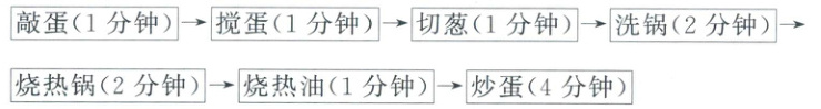 敲蛋(1分钟)→搅蛋(1分钟)→切葱(1分钟)→洗锅(2分钟)→烧热锅(2分钟)→烧热油(1分钟)→炒蛋(4分钟)