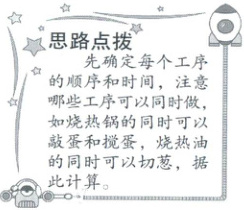1. 梓晨长大了,想和妈妈学做菜,星期天要学做一个炒鸡蛋,妈妈告诉她这道菜有以下几项工序:
