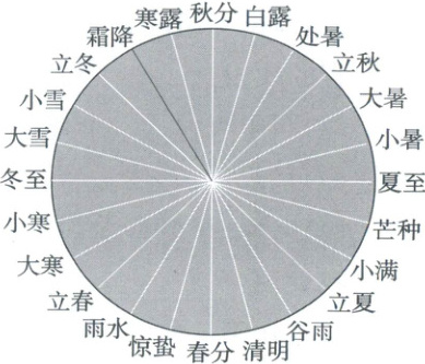 2.(学科融合)二十四节气把太阳周年运动轨迹划分为24等份,每 $ 15^{\circ} $ 为一等份,每一等份为一个节气。2024年10月23日是二十四节气中的“霜降”。右图节气中,与“霜降”形成 $ 135^{\circ} $ 夹角的是(