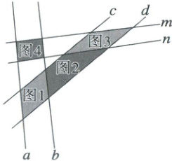 5. 如图中,直线 $ a $、$ b $ 互相平行,$ c $、$ d $ 互相平行,$ m $ 和 $ n $ 不平行。那么,图1、图2、图3中,(