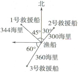 (2)1号救援船在渔船北偏西 45°方向 344 海里,2 号救援船在渔船北偏东 30°方向 300 海里,3 号救援船在渔船西偏南 60°方向 360 海里。
