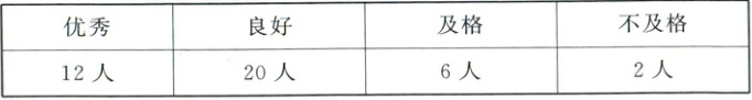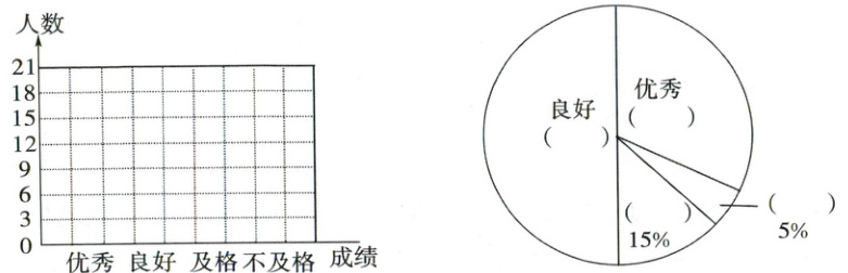 条形统计图:优秀对应 12 人,良好对应 20 人,及格对应 6 人,不及格对应 2 人,在条形统计图相应位置画出对应高度的直条。