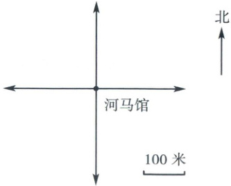 (1)由于图上1厘米代表实际100米,所以猴山在河马馆的正北方向 $200 ÷ 100=2$(厘米)处,在平面图上,以河马馆为原点,向上方(北方向)画2厘米长度确定猴山位置。