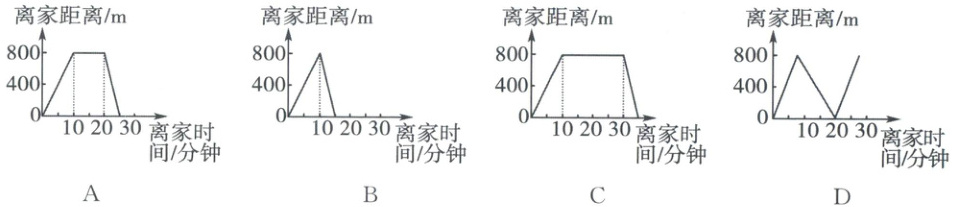 3. (数形结合)星期六早晨,王芳到离家800m的体育馆练习打羽毛球,走路用了10分钟,然后用20分钟练习打羽毛球,练完后跑步回家,用了5分钟。下面四幅图中,能正确显示出王芳离家时间和离家距离关系的是(