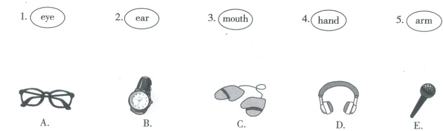 七、读一读,连一连,将身体部位与相关的物品对应。(5分)