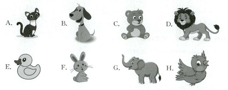 任务一:眼睛涂黑色;嘴巴涂红色;耳朵涂棕色;腿涂黄色;胳膊涂紫色。任务二:圈出 A、B、C、E、F