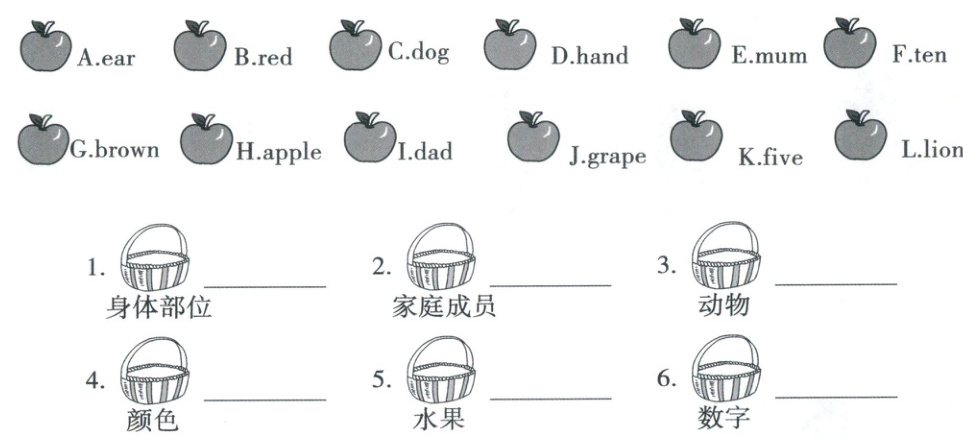 一、秋天到了,果园里的苹果熟了。小朋友们一起来果园摘苹果。请根据提示,将他们摘的苹果归类。(12分)