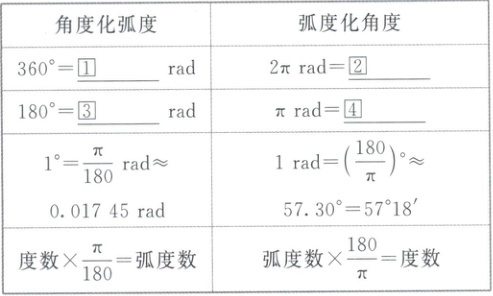 提示 角度制表示为$360^{\circ}$,弧度制表示为$2\pi\ rad$.