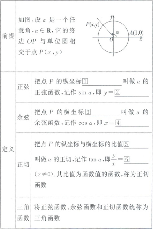 ①y ②sinα ③x ④cosα ⑤$\frac{y}{x}$ ⑥tanα
