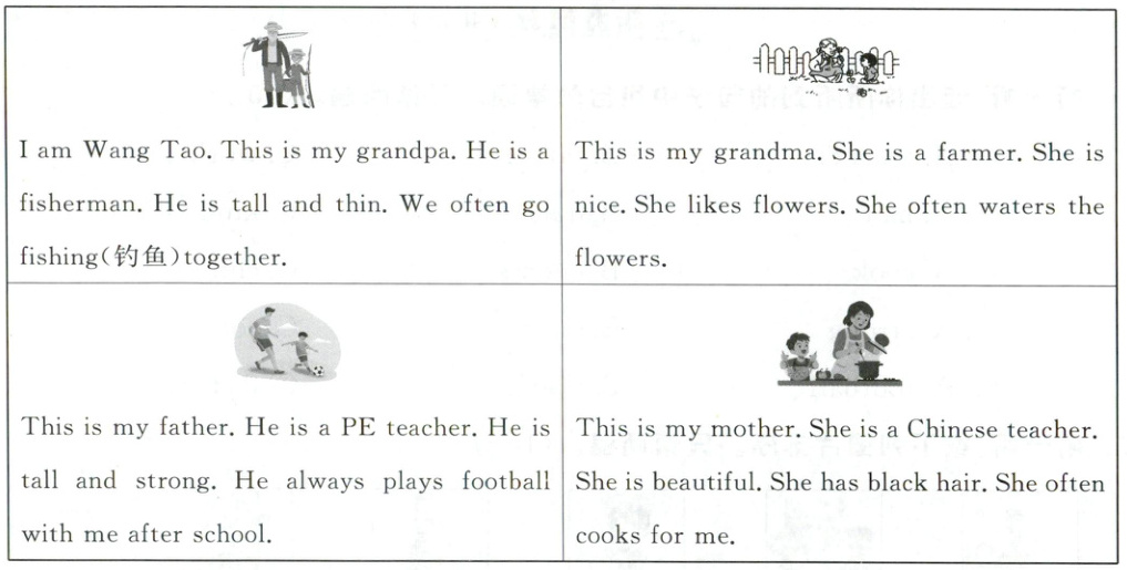 I am Wang Tao. This is my grandpa. He is a fisherman. He is tall and thin. We often go fishing (钓鱼) together.