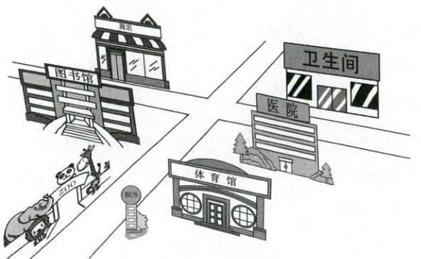1. playground 2. library 3. museum 4. shop 5. hospital