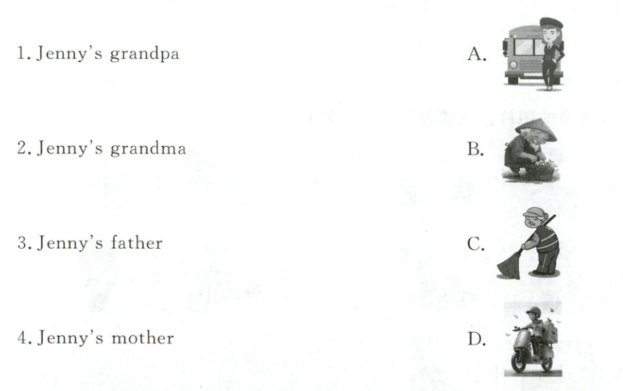 Hello, my name is Jenny. I'm nine. I'm a student. I have a happy family. Look, this is a photo of my family. The old man is my grandpa. He's a farmer. The old woman is my grandma. She's a cleaner. Look at this man. He's my dad. He's a delivery worker. That woman is my mum. She's a bus driver. And this is my sister Susan. She is a quiet girl. She's a student, too. Look! She is cooking for us. And she often helps me with English. I love my family.