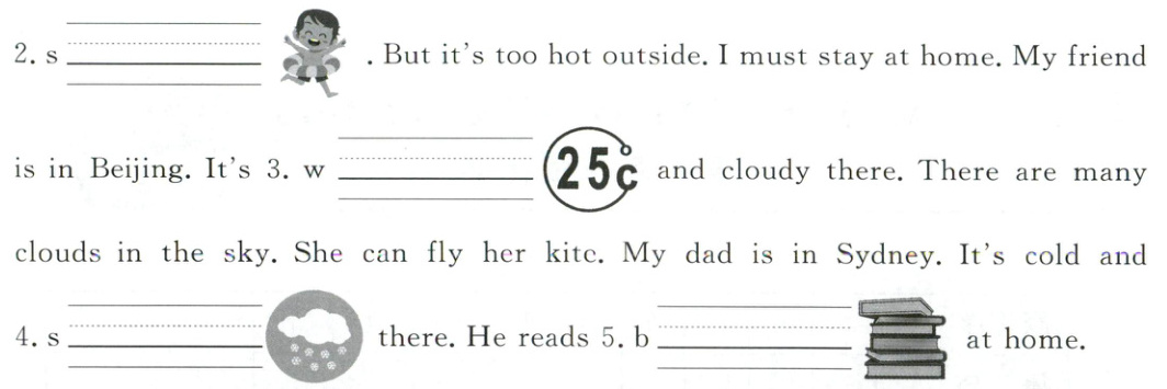 1. sunny 2. swim 3. warm 4. snowy 5. books