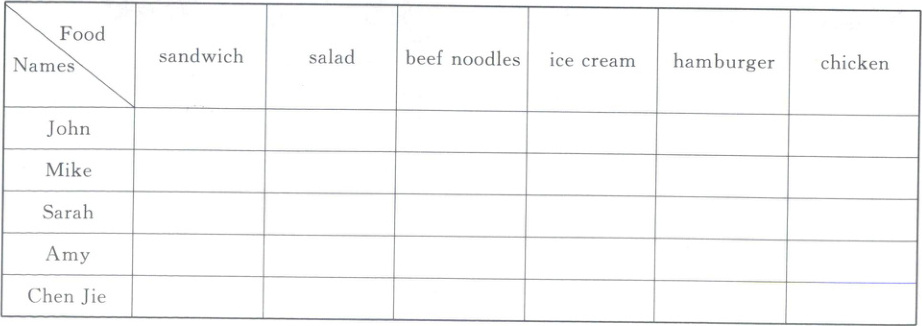 John: sandwich, chicken;Mike: beef noodles, ice cream;Sarah: salad;Amy: beef noodles, hamburger;Chen Jie: sandwich, salad