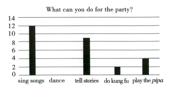. We will have a wonderful party!任务二:此统计表中有一项数据缺失,请根据上面的内容,将柱状图补充完整。(2分)