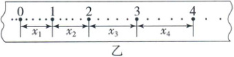(3) 实验中得到一条纸带如图乙所示,打点计时器打点频率为 $ 50Hz $,从比较清晰的点起,每 $ 5 $ 个计时点取一个计数点,分别标明 $ 0 $、$ 1 $、$ 2 $、$ 3 $、$ 4 $、…$$,量得 $ 0 $ 与 $ 1 $ 两点间距离 $ x_{1} = 30mm $,$ 1 $ 与 $ 2 $ 两点间距离 $ x_{2} = 36mm $,$ 2 $ 与 $ 3 $ 两点间距离 $ x_{3} = 42mm $,$ 3 $ 与 $ 4 $ 两点间的距离 $ x_{4} = 48mm $,则小车在打计数点 $ 2 $ 时的瞬时速度为____ $ m/s $,小车的加速度 $ a $ 的计算表达式为____(用题中的物理量表示,设相邻计数点间的时间间隔为 $ T $)。