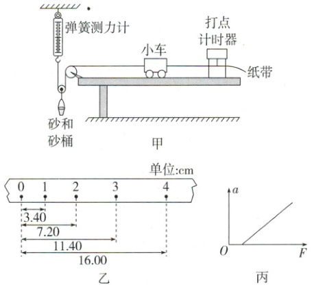 (3) 实验中改变砂和砂桶总质量,依次记录弹簧测力计的示数 $ F $ 并求出所对应的小车加速度大小 $ a $,画出的 $ a - F $ 图像是一条直线如图丙所示,则图像不过原点的原因是