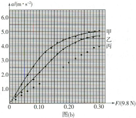 (2) 小车的质量 $ M_{1} = 320g $。利用光电门系统测出不同钩码质量 $ m $ 时小车加速度 $ a $。钩码所受重力记为 $ F $,作出 $ a - F $ 图像,如图(b)中图线甲所示。