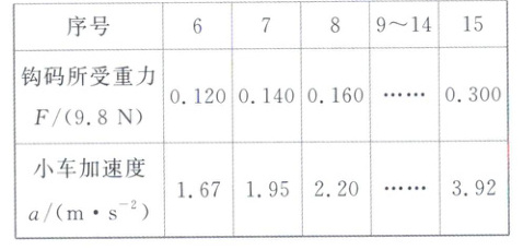 。再将小车的质量增加至 $ M_{3} = 720g $,重复步骤(2)的测量过程,记录钩码所受重力 $ F $ 与小车加速度 $ a $,如表所示(表中第 $ 9 \sim 14 $ 组数据未列出)。(5) 请在图(b)中补充描出第 $ 6 $ 至 $ 8 $ 三个数据点,并补充完成图线丙。