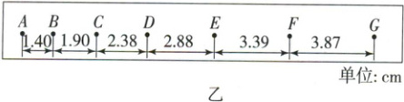 (4)该小组在规范操作下得到一条点迹清晰的纸带如图乙所示,在纸带上依次选出 $ 7 $ 个计数点,分别标上 $ A $、$ B $、$ C $、$ D $、$ E $、$ F $ 和 $ G $,每相邻的两个计数点间还有四个打点计时器打下的点未画出,打点计时器所用电源的频率是 $ 50 \, Hz $。(以下结果均保留 $ 2 $ 位小数)