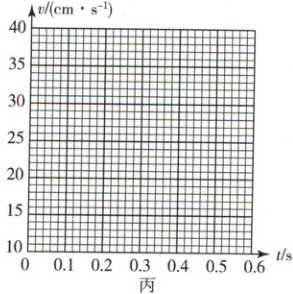 ② 分别算出其他各点的速度:$ v_{B}= 16.50 \, cm/s $,$ v_{C}= 21.40 \, cm/s $,$ v_{E}= 31.35 \, cm/s $,$ v_{F}= 36.30 \, cm/s $,请在图丙所示的坐标系中作出小车运动的 $ v - t $ 图像(以打 $ A $ 点时开始计时),并说明小车速度变化的规律