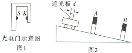 例3 (2025·甘肃武威市开学考) 光电门是物理实验中用来测量时间的一种常用设备,如图1所示,$ S $ 是光源,$ K $ 是光接收器,当有不透明物体通过光电门时,物体会遮住光源,接收器 $ K $ 接收不到光信号,计时器便开始计时,当物体通过后,接收器 $ K $ 重新接收到光信号,计时结束,即可记录物体通过光电门所用的时间。如图2所示,某同学用光电门测量小车沿斜面向下运动的速度,小车上安装有遮光板,$ A $、$ B $ 是安装在斜面上不同位置的两个光电门。