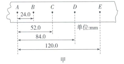 2. 在用打点计时器研究小车速度随时间变化规律的实验中得到的一条纸带如图甲所示,(实验中打点计时器所接低压交流电源的频率为 $ 50 \, Hz $)相邻两计数点间有 $ 4 $ 个打点计时器打下的点未画出,依照打点的先后顺序依次编号为 $ A $、$ B $、$ C $、$ D $、$ E $,都为计数点。测得 $ s_{AB}= 24.0 \, mm $、$ s_{AC}= 52.0 \, mm $、$ s_{AD}= 84.0 \, mm $、$ s_{AE}= 120.0 \, mm $,则: