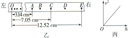 $ m/s^{2} $。(计算结果均保留3位有效数字)(4) 通过图像也可以得出重力加速度,并且能剔除偶然误差较大的数据,提高实验的准确程度。若丙图中的 $ v^{2}-h $ 图像的斜率为 $ k $,则重力加速度 $ g = $