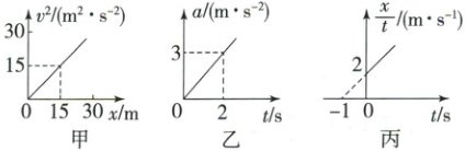 [解析] 根据速度与位移的关系有$v^{2}=2ax$,结合题图甲有$2a=\frac {15}{15}m/s^{2}$,解得物体加速度大小$a=0.5m/s^{2}$,故A错误;a-t图像中,根据图像与时间轴所围几何图形的面积表示速度的变化量可知,前2s内物体的速度变化量大小$\Delta v=\frac {3×2}{2}m/s=3m/s$,故B错误;题图丙的图像对应的函数表达式为$\frac {x}{t}=2t+2$,则有$x=2t+2t^{2}$,将该函数式与位移公式进行对比有$v_{0}=2m/s,\frac {1}{2}a=2m/s^{2}$,解得$a=4m/s^{2},t=3s$时物体的速度大小$v_{t}=v_{0}+at=14m/s$,故C正确,D错误。
