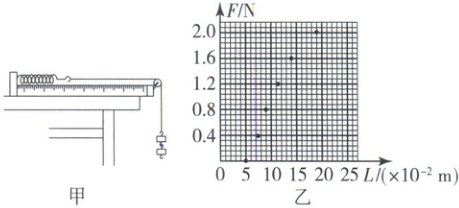 $N/m$(保留2位有效数字)。(3)该同学的测量、记录及描点都规范正确,但图乙中的一个描点$(19cm, 2.0N)$位置明显有偏差,造成这个现象的原因是: