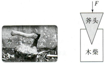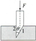 例8 一凿子两侧面与中心轴线平行,尖端夹角为θ,当凿子竖直向下插入木板中后,用锤子沿中心轴线竖直向下以力F敲打凿子上侧时,凿子仍静止,侧视图如图所示。若敲打凿子时凿子作用于木板1、2面的弹力大小分别记为$F_1、$$F_2,$忽略凿子受到的重力及摩擦力,下列判断正确的是(