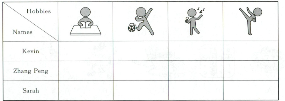 My name is Kevin. I like doing kung fu. And I like singing English songs too. I sing English songs every day. I have two good friends. Zhang Peng is an active boy. He likes playing football. We often play football on weekends. Sarah is a quiet girl. She likes reading books. We usually read books in the park. We often go to school by bike. Do you have any good friends? What are their hobbies?