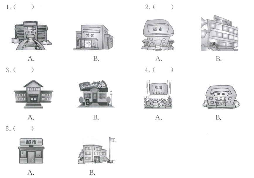 )5. A. I like reading books. B. It's next to the supermarket. C. I want to buy some books.