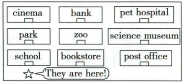 They're interested in robots. Now they are in front of the school. They can go straight and turn left at the bookstore. Then go straight and turn right at the first crossing. Go straight again and the science museum is on their left.