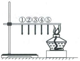 7. 如图所示,用蜡在铁丝上粘上五根火柴,用酒精灯在右端给铁丝加热,加热后火柴落下的先后顺序是(