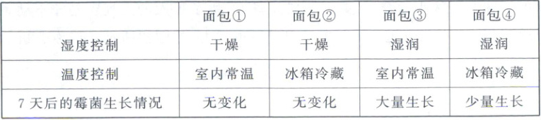2.(16 分)小明在四块相同的干面包上分别放一些霉菌,然后将面包放置在不同环境中培养。7 天后,观察四块面包上的霉菌生长情况,并记录在下表中。