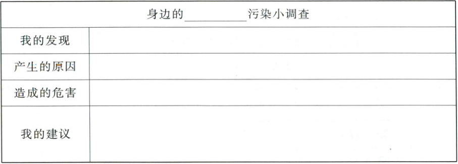 在我们的生活中,除了“白色污染”,还有哪些环境污染呢?请选择一项内容进行调查和研究,完成下面的表格。