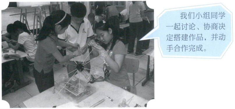 理由提示:小组同学一起讨论、协商决定搭建作品,体现了小组成员相互沟通、合作的品质。