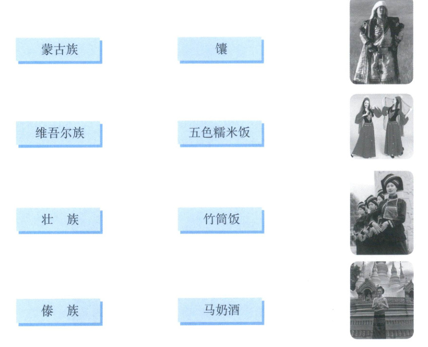 我国各民族在长期发展过程中,生活环境、文化习俗等都有差异,请将下面各民族与对应的饮食和服饰进行连线。