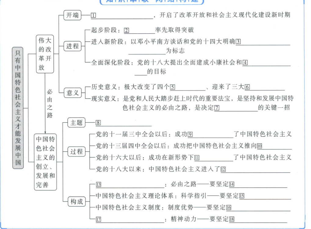 ①党的十一届三中全会 ②农村改革 ③建立社会主义市场经济体制目标 ④全面深化改革开放 ⑤面貌 ⑥飞跃 ⑦当代中国命运 ⑧中国特色社会主义 ⑨开创 ⑩二十一世纪 ⑪坚持和发展 ⑫新时代 ⑬中国特色社会主义道路 ⑭道路自信 ⑮理论自信 ⑯制度自信 ⑰中国特色社会主义文化自信 ⑱文化自信