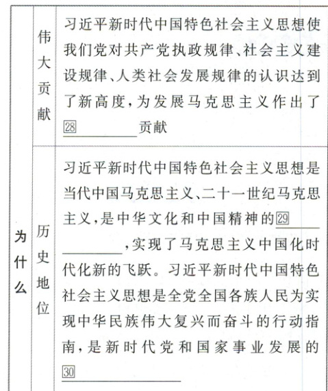 成果丰富发展了这一重要思想。(4)“十个明确”“十四个坚持”“十三个方面成就”彼此呼应、相互贯通,明确了新时代坚持和发展中国特色社会主义的㉕