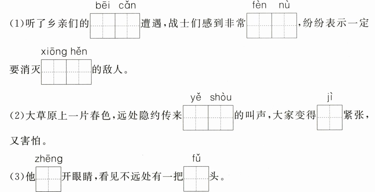(2) 先把词语补充完整,再根据意思选词填空。(5分)
