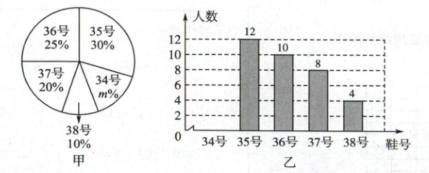 为了方便学生参加体育锻炼,某学校准备购买一批运动鞋供学生体育锻炼时使用. 现从各年级随机抽取了部分学生的鞋号,绘制出如下不完整的统计图甲和图乙. 请根据有关信息,解答下列问题.