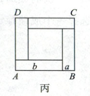 (1)若取其中的若干个(三种图形都要取到)拼成一个长方形,使其面积为$3a^{2} + 5ab + 2b^{2}$,在虚框中画出图形,并根据所画图形,将多项式$3a^{2} + 5ab + 2b^{2}$分解因式为______.(2)如图丙是用$B$类长方形(4 个)拼成的图形,其中四边形$ABCD$是大正方形,边长为$m$,里面是一个空的小正方形,边长为$n$. 观察图案并判断,将正确关系式的序号填写在横线上:______.