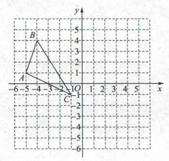 如图,在平面直角坐标系$xOy$中,$\triangle ABC三个顶点的坐标分别为A(-5,1)$,$B(-4,4)$,$C(-1,-1)$。将$\triangle ABC$向右平移5个单位长度,再向下平移4个单位长度,得到$\triangle A'B'C'$,其中点$A'$,$B'$,$C'分别为点A$,$B$,$C$的对应点。