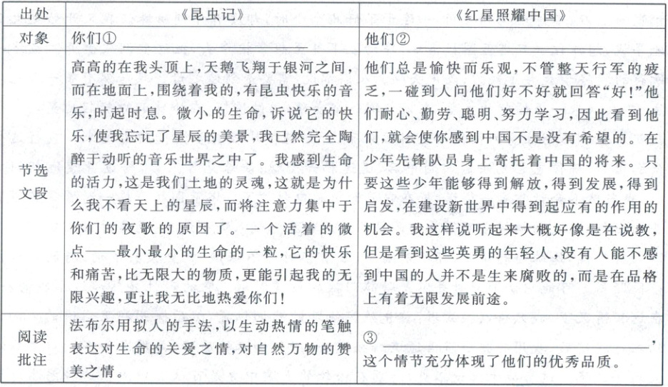 19. 任务一:根据《昆虫记》和《红星照耀中国》的阅读任务单,填写①②③处的内容。(3 分)