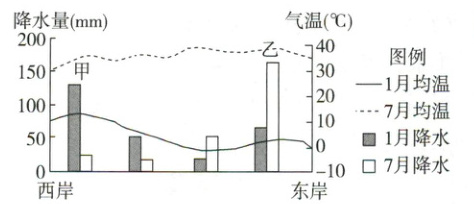 (2025·广东广州高二校考)读沿$32^{\circ}N$纬线某大陆1月和7月不同地点气温曲线和降水柱状图,完成3~4题。